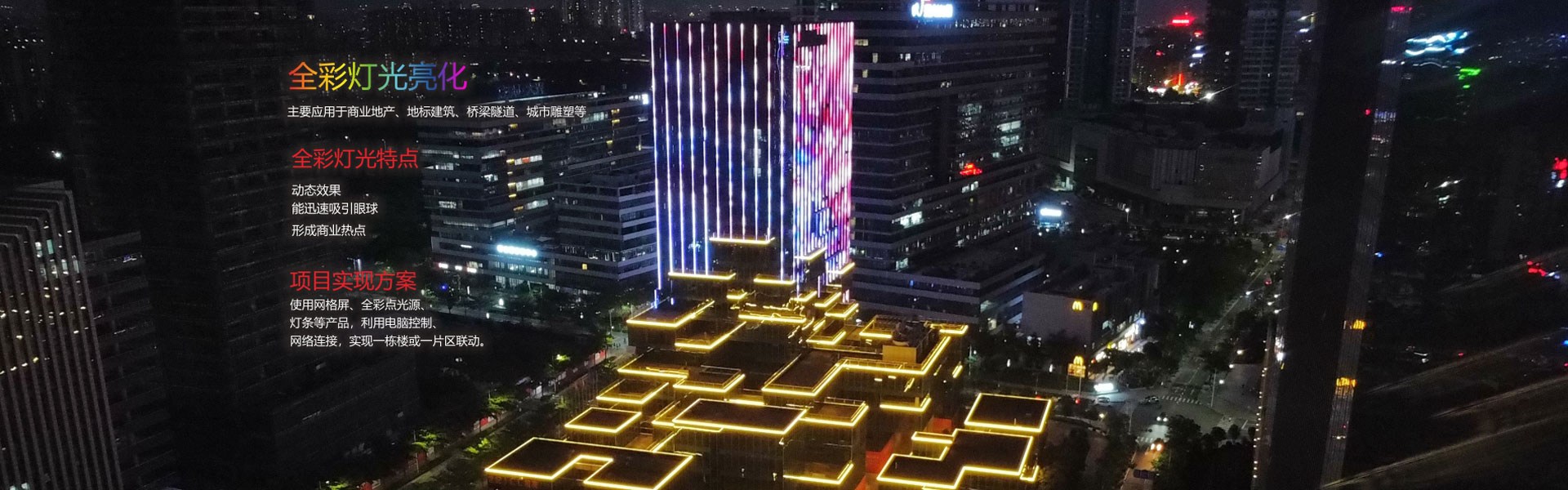 全彩LED燈光是通過(guò)安裝帶DMX512控制芯片的燈具,再通過(guò)電腦、控制器進(jìn)行編程,使燈光能按程序展現(xiàn)不同效果,常用效果有炫彩、跑馬···